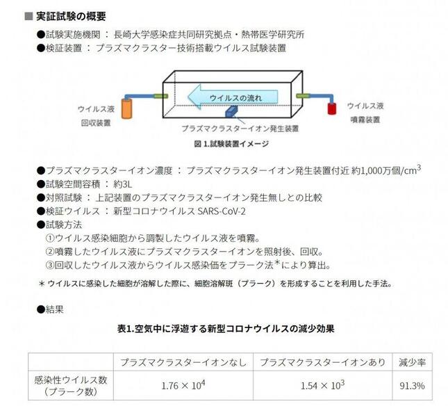 実験は、プラズマクラスター技術を搭載したウイルス試験装置(容積約3リットルの空間)を使って行い、実験に参加した長崎大の安田二朗教授(新興ウイルス感染症学)は「実空間で抗ウイルス効果を発揮する可能性があると期待されます」とコメントしている。
