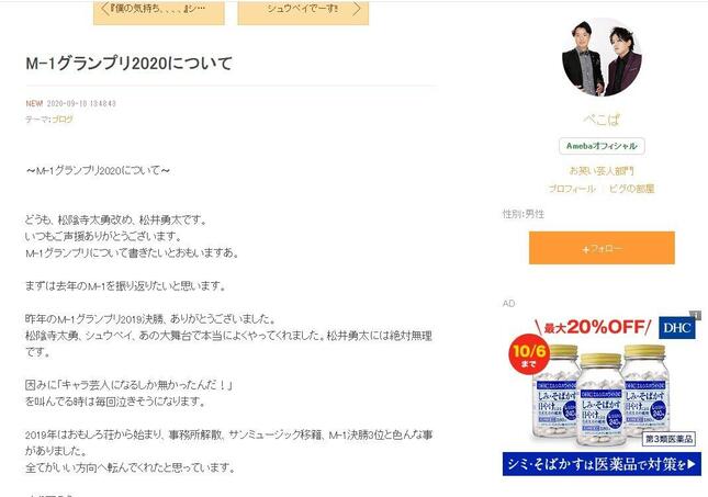 お笑いコンビ・ぺこぱの松陰寺太勇さんが2020年9月10日、コンビのブログで、今年の「M-1グランプリ2020」(ABC・テレビ朝日系)に出場することを表明した。