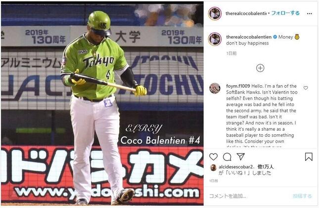 ソフトバンク・バレンティンが2020年9月29日夜、自身のインスタグラムを更新したが、その投稿が話題を呼んでいる。ヤクルトのユニフォームを着てバットを持った過去の写真を添え、「Money don't buy happiness(お金で幸せは買えない)」と意味深なメッセージを綴った。