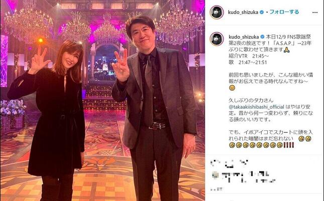写真は、きらびやかな番組セットでピースサインをして微笑む工藤さんと石橋さん。工藤さんは、「本日12/9 FNS歌謡祭第2夜の放送です!『A.S.A.P』→23年ぶりに歌わせて頂きます」とメッセージを添えている。