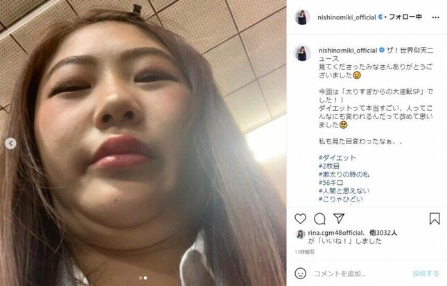 1枚目の写真は「ザ!世界仰天ニュース」(日本テレビ系)のロゴパネルを持った現在の西野さんで、2枚目は激太りした時の西野さんの顔を下から撮った二重あごの写真。西野さんは、「ザ!世界仰天ニュース見てくださったみなさんありがとうございました」「私も見た目変わったなぁ、、」とメッセージを添えている。ハッシュタグでは「#2枚目 #激太りの時の私 #56キロ #人間と思えない #こりゃひどい #もはや妖怪 #こんな自分に戻りたくない」とつづっている。この日の放送は「太りすぎからの大逆転SP」がテーマで、西野さんも自身のダイエット体験を明かした。