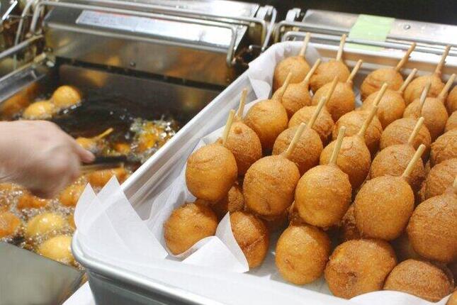 「ひょうたん揚げ」は蒸した蒲鉾を、甘い味付けの衣で包んで揚げた「アメリカンドック」風のスナック。球状の蒲鉾が2つ串刺しになっており、「ひょうたん」のように見えるのが特徴だ。「笹かまぼこ」を名付けたことでも知られる阿部蒲鉾店が1985年に開発し、以降は仙台市中心部にある阿部蒲鉾店本店などで販売。本店では「多いときでは一日4000本以上も売れるほどの人気ぶり」(阿部蒲鉾店公式サイトより)で、長年にわたり仙台名物として愛されてきた。