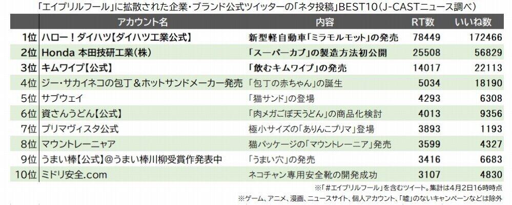 一体、どんな企画がユーザーの心をとらえたのか。J-CASTニュースはSNS分析ツールを用いて、4月1日に拡散された企業公式アカウントの「エイプリルフール投稿BEST10」を調べてみた。