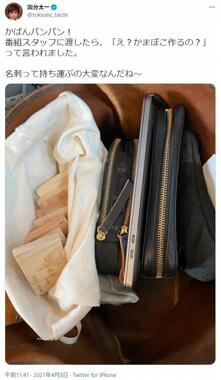 国分さんはツイッターにカバンの中身を写した写真を投稿。革製のバッグには、財布やポーチ、ノートパソコンなどとともに、アイボリーの布袋に入った複数の「木板」が並んで収まっている。