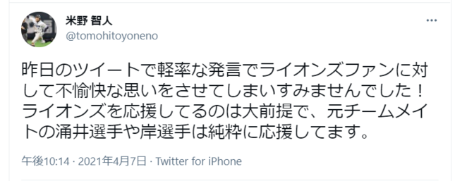 「昨日のツイートで軽率な発言でライオンズファンに対して不愉快な思いをさせてしまいすみませんでした!
