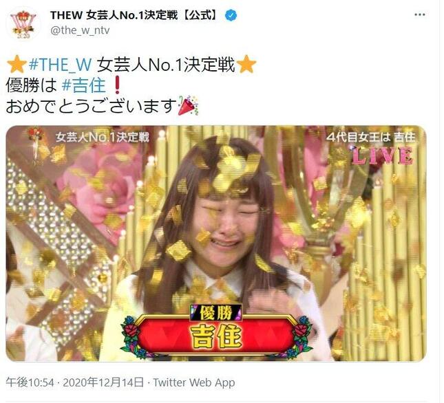 2020年12月の「THE W」で優勝した吉住さん(「THE W」公式ツイッターより)