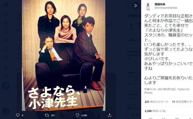 と悼んだ。黒いソファに座る小津先生役の田村さんを、教師役だった西田さん、ユースケ・サンタマリアさん、瀬戸朝香さん、京野ことみさんが囲んでいるドラマのポスター写真が添えられている。