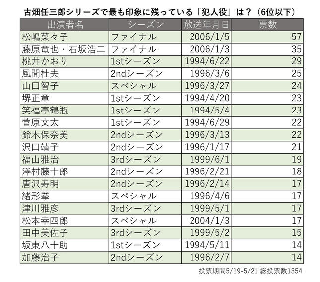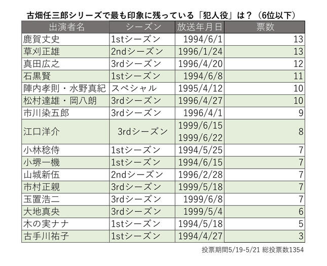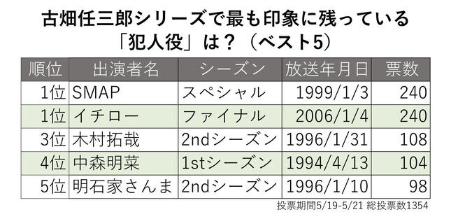 投票は21年5月19日に開始し、21日17時時点で集まった1354件を集計。ここでは上位5組にランクインした「犯人役」を発表する。