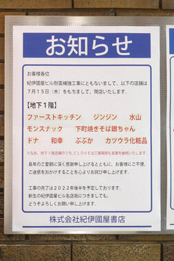 そうした中、ツイッター上では5月26日頃から、紀伊國屋書店のビルに張り紙が掲出されていたと話題になった。張り紙の内容は、地下1階に入居するほとんどの店舗が、ビルの耐震補強工事に伴い7月15日に閉店するというものだった。