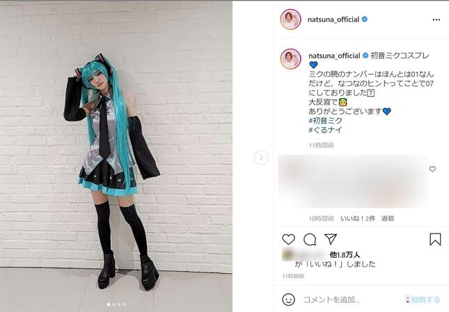 夏菜さんは、「初音ミクコスプレ ミクの腕のナンバーはほんとは01なんだけど、なつなのヒントってことで07にしておりました 大反響で ありがとうございます」とメッセージを添えている。夏菜さんはこの日放送されたバラエティー番組「ぐるぐるナインティナイン」(日本テレビ系)の「ダレダレ?コスプレショー」の企画で、初音ミクのコスプレ姿で登場し話題になった。