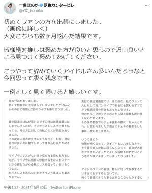 同ファンからは「ライブ中のレス(編注:ライブ中にアイドルから個別に目線や指差し等の反応を貰うこと)がない」として怒られることもあったそうだが、一色さんは「ライブ中に頻繁に移動するその人をステージから探しながら必死にレスを送っているつもり」であり、他のファンと同様に大切にしていたとつづった。