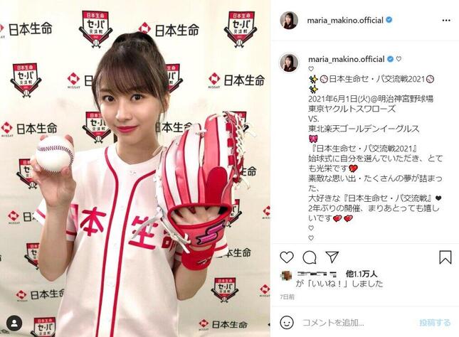 • 牧野真莉愛さんのインスタグラム(@maria_makino.official)6月1日投稿より。ヤクルト-楽天戦で始球式をつとめた