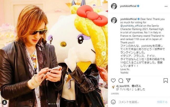 ロックバンド「X JAPAN」のYOSHIKIさんが2021年6月10日に、インスタグラムで「2021年サンリオキャラクター大賞」の結果を報告した。