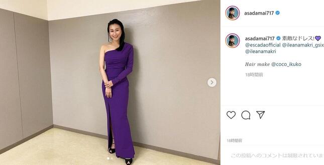 投稿されたのは、右肩を出し右足は大胆なスリットの入った紫色のドレス、つま先がちらりと覗く黒のハイヒール姿で微笑む浅田さんの全身ショットとバストショット。