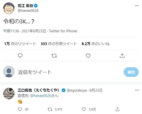 この放送は、江口さんと親交のある人気声優らがツイッターで反応した影響もあってか、ネット上で大きな注目を集めることに。コーナー自体は2分に満たない短い放送だったにも関わらず、「令和の3K」という言葉がトレンド入りする事態となった。