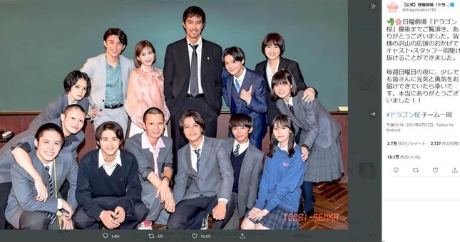 ドラマの放送終了直後、公式ツイッターは「日曜劇場『ドラゴン桜』最後までご覧頂き、ありがとうございました」とのメッセージを添えつつ、2枚の写真をツイート。うち1枚が、話題になった記念写真だ。