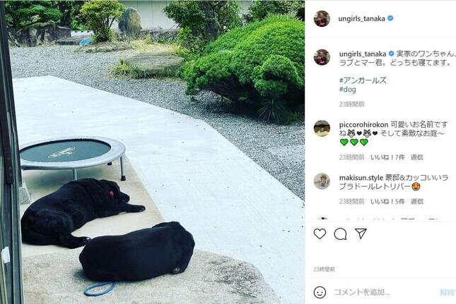 田中さんは、「実家のワンちゃん、ラブとマー君。どっちも寝てます。 #アンガールズ #dog」とメッセージを添えている。ラブは今年1月にも田中さんのインスタグラムに登場。実家の庭に雪が積もりはしゃいでいる動画がアップされている。