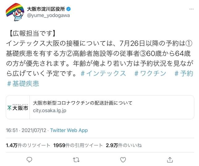 JR新大阪駅などが立地し、人口18万人を擁する淀川区。同区役所の公式ツイッターは、このインテックス大阪での接種予約についてツイートで説明し、「基礎疾患を有する方」「高齢者施設等の従事者」「60歳から64歳の方」を優先的に受け付けるとした。