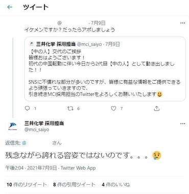 注目を集めているのは、ツイッターアカウント「三井化学 採用担当」(@mci_saiyo)。初投稿は2021年1月15日で、プロフィール欄には「三井化学の新卒/中途採用の公式アカウントです 当社の採用情報やニュースを発信していきます」とある。