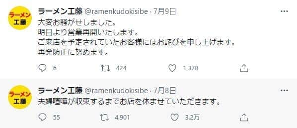はたして、本当に「夫婦喧嘩」が原因で休業したのだろうか。J-CASTニュースは、ラーメン工藤の店主・工藤丈明さん(30)を取材した。