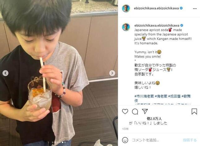 歌舞伎俳優の市川海老蔵さん(43)が、息子の勸玄くん(8)がシロップから作ったという梅ソーダをインスタグラムで披露した。