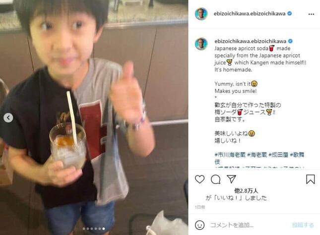 あわせてアップされた写真では、自家製シロップで作ったという「梅ソーダ」を飲んで、満足そうに親指を立てる勸玄くんの様子がうかがえる。海老蔵さんは、
