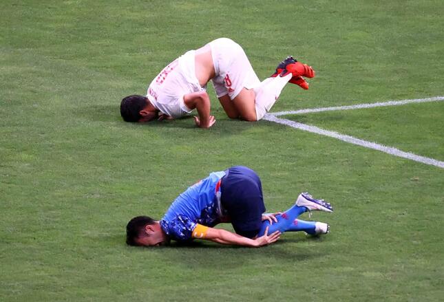東京五輪・男子サッカー準決勝の試合中、日本代表の吉田麻也選手とスペイン代表のミケル・メリーノ選手の動きが「シンクロ」する瞬間がカメラに捉えられ、話題となっている。