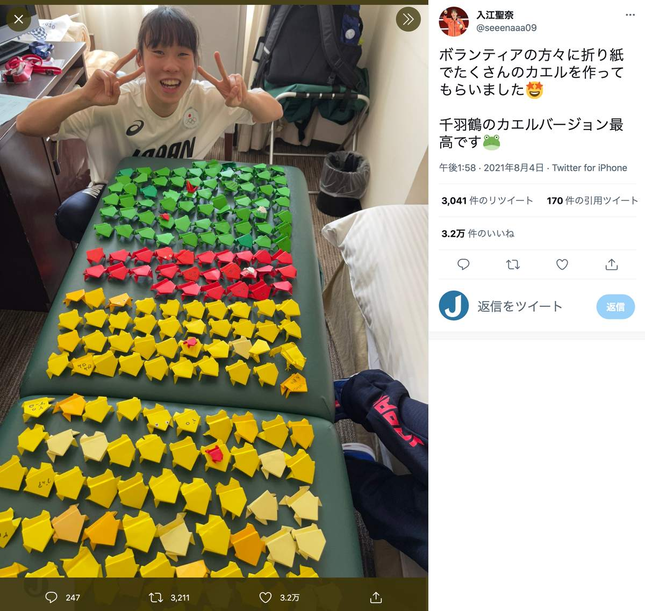 添付された写真には、ピースサインで笑顔を浮かべる入江選手の前に、緑・黄・赤・白の4色のカエルの折り紙が大量に並ぶ。「千羽鶴のカエルバージョン最高です」と喜んだ。