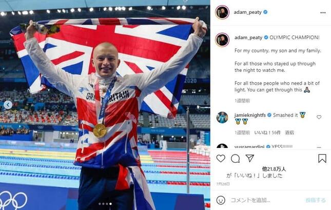 東京五輪・競泳の2種目で金メダル、1種目で銀メダルを獲得したイギリス代表のアダム・ピーティ選手(26)が試合後のインタビューで語った「五輪の意義」が、「かっこいい」と話題になっている。