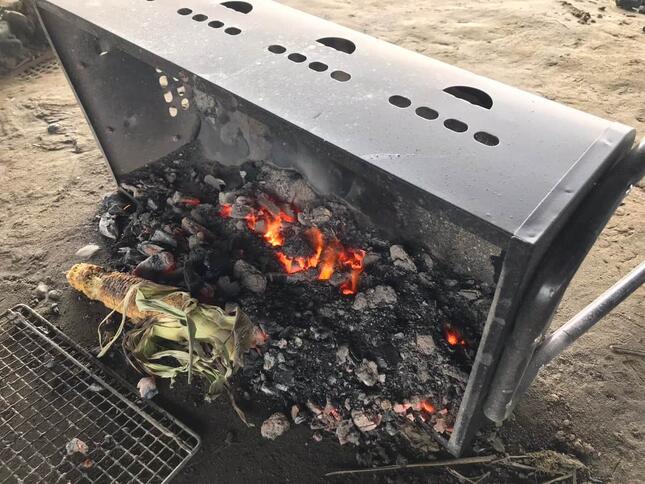 コンロは横倒しになって煙が出ており、別の写真では、火が点いた炭が赤々と燃えている様子が写っていた。