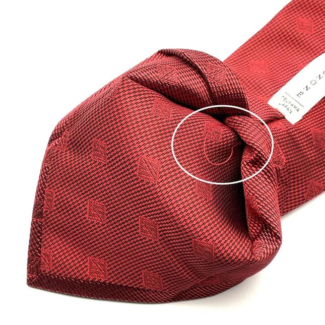 ネクタイの大剣の裏側から、細い糸がたるみ出てしまうことがある。笏本さんによれば、この糸は「スリップステッチ」と呼ばれる。ネクタイの伸縮性を維持する長い一本の糸で、切ってしまうとネクタイがほつれてしまうという。