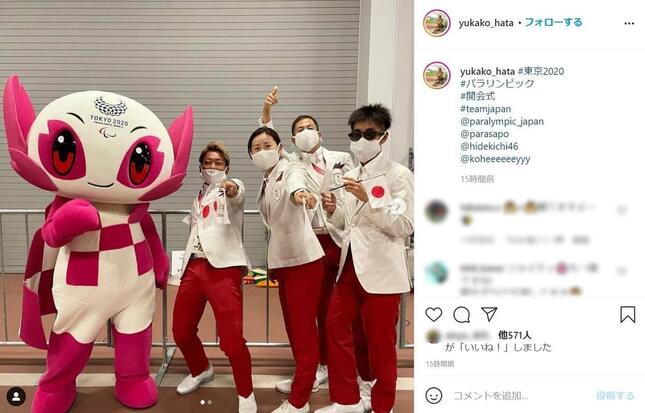 投稿には、パラリンピック・トライアスロン代表の秦由加子選手のインスタグラムの写真が添えられていた。秦選手ら日本代表とソメイティとの集合写真だ。国立競技場内で選手入場前に撮影したとみられる。
