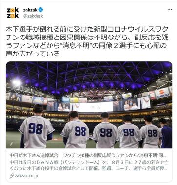 「中日が木下さん追悼試合 ワクチン接種の副反応疑うファンから"消息不明"同僚2選手に心配の声 憶測呼ぶ真相とは」と題し、中日の滝野選手らが試合から数か月遠ざかっていると報じている。