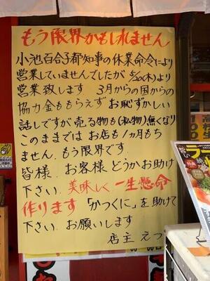 ただ、日本は法治国家であるため、「県の命令に従い閉店します」とした。これ以上の説明が必要なときは、県の危機管理課に問い合わせてほしいとし、連絡先も付記してあった。