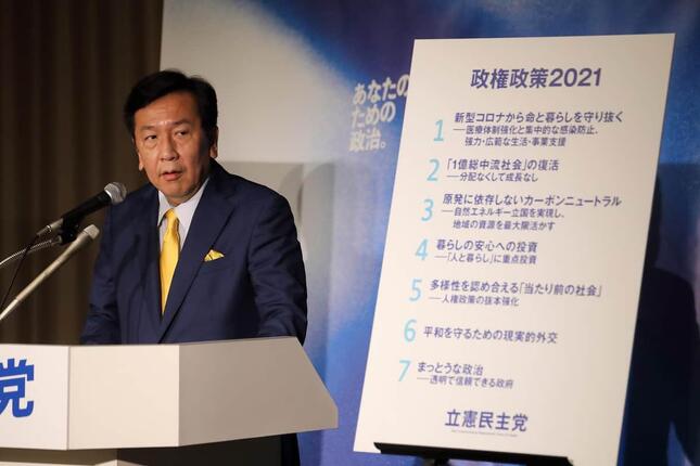 「政権政策2021」と題して発表された全14ページの公約集は、(1)新型コロナから命と暮らしを守り抜く(2)「1億総中流社会」の復活(3)原発に依存しないカーボンニュートラル(4)暮らしの安心への投資(5)多様性を認め合える「当たり前の社会」(6)平和を守るための現実的外交(7)まっとうな政治、の7つが柱。(1)では医療・介護への支援や、生活支援策を掲げた。(2)では法人税の最高税率を引き上たり金融所得課税を強化したりして再分配を強化する。(7)では、森友・加計問題を念頭に、透明性を高める。