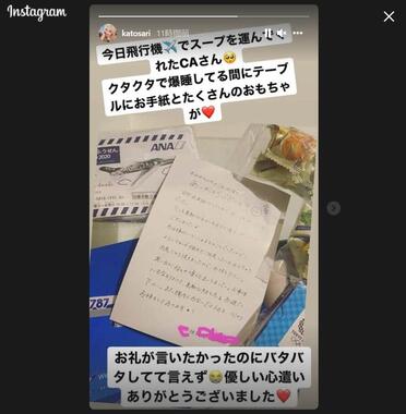 とつづり、ANAの風船などのおもちゃと手紙を広げた状態で撮影した写真をアップ。手紙は直筆で、機内にあったおもちゃを子どものために用意したことや、加藤さんの体調を気遣う言葉などが記されていた。