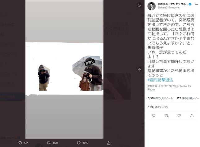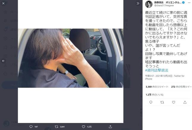とツッコミつつ、記者やカメラマンらの写真をアップ。写真に映った記者らの顔は加工されて隠されており、藤森さんは、「目隠し写真で勘弁してあげます」と説明。ただし、「嘘記事書かれたら動画も出そうっと」とつづり、投稿に「週刊誌撃退法」というハッシュタグを記していた。