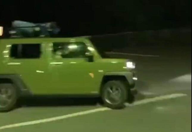 軽自動車のルーフにあるキャリアに、若い男性が仰向けに寝そべっている。車は、暗い駐車場の中、ライトを点けて走っており、その様子を見ている仲間の男性が「ウ~」と奇声を上げ、はやし立てる。