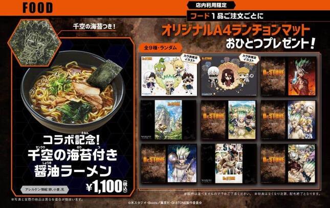 被害を受けたと報告したツイッターユーザーは、池袋東口店を利用。税込み1100円の「コラボ記念!千空の海苔付き醤油ラーメン」を注文した。1品注文ごとにノベルティのオリジナルA4ランチョンマットが付く。メニューに掲載されたイメージ写真では、チャーシュー、海苔、ネギ、ほうれん草、メンマなどの具材が確認できる。