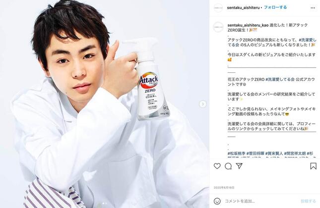 「洗濯愛してる会」のメンバーは菅田さんのほかに俳優の賀来賢人さん、松坂桃李さん、間宮祥太朗さん、杉野遥亮さんの5人だ。次のような設定のもと商品プロモーションのため19年4月に「結成」された。