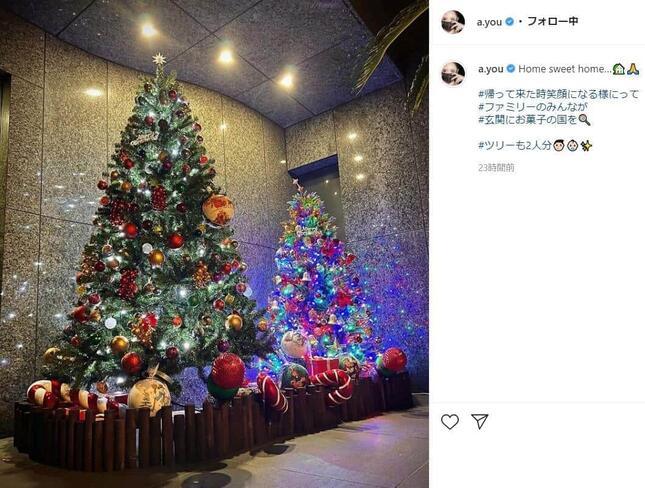 歌手の浜崎あゆみさんが2021年11月17日、自宅玄関に設置された特大クリスマスツリーの写真をインスタグラムで公開した。