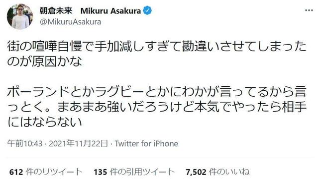 こうした批判を受け、朝倉さんは11月22日にツイッターで、「街の喧嘩自慢で手加減しすぎて勘違いさせてしまったのが原因かな」「ポーランドとかラグビーとかにわかが言ってるから言っとく」とし、「まあまあ強いだろうけど本気でやったら相手にはならない」と反論していた。