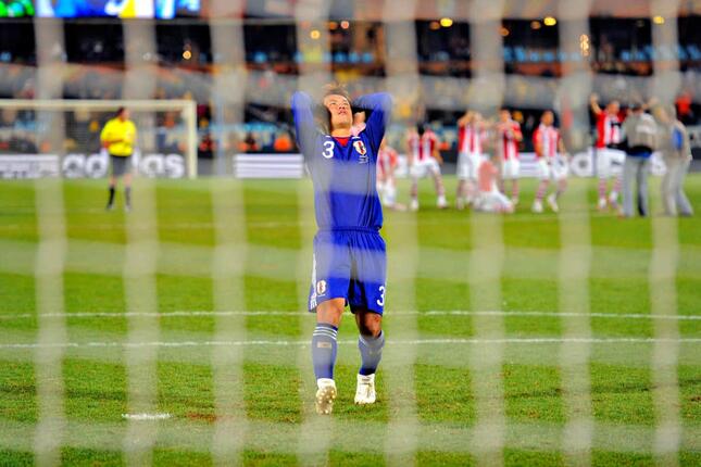• パラグアイ戦でPKを外し頭を抱える駒野(写真:L’EQUIPE/アフロ)
