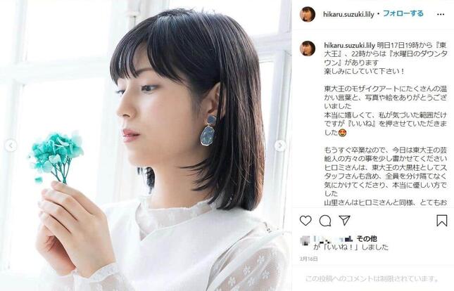 鈴木さんは大学1年生の2017年から同番組に出演。東京大学を卒業する2021年3月をもって番組も卒業し、3月31日のインスタグラムではメディア活動への参加終了を報告していた。