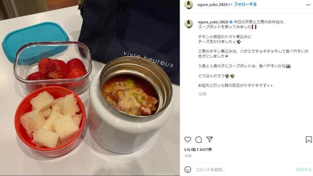 小倉さんは6日にインスタグラムを更新し、「今日の次男と三男のお弁当は、スープポットを使ってみました」と、保温に便利なスープポットを使ったお弁当を持たせたことを報告。中身はチキンと枝豆のトマト煮込みにチーズをかけたもので、角切りのパンやいちごも別容器で添えていた。
