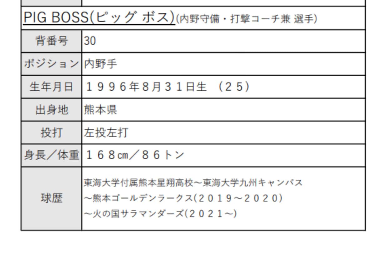 さらに、球団は「PIG BOSS」を正式な登録名に設定。公式サイトに掲載されたプロフィールの体重は「86トン」(本来はキロ)になっていた。猪口選手の「思い付き」に、球団も便乗した形だ。