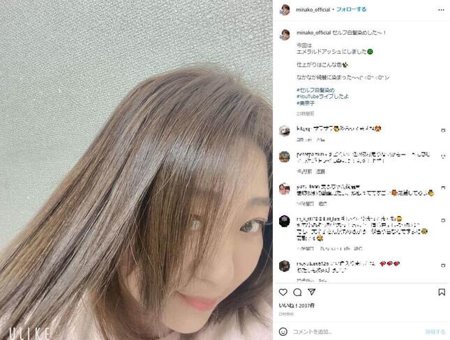 美奈子さんは「セルフ白髪染めした~!」として、自撮り写真を公開。斜め上から撮影した写真で「今回はエメラルドアッシュにしました」と報告した。「なかなか綺麗に染まった~」と自画自賛している。