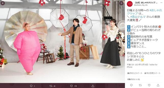 歌手の青山テルマさんが2021年12月19日に放送された「おしゃれクリップ」(日本テレビ系)にゲスト出演し、その衣装が理由でインターネット上では「話が一切入ってこない」などと驚く声があがった。