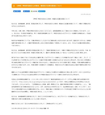 報道機関に向けたもので、神田さんに関する報道について「冷静かつ慎重な対応をすることを求めます」などと訴えている。