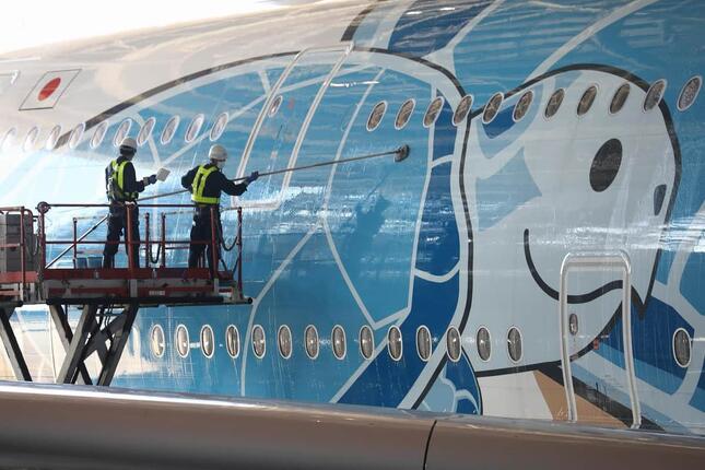 1号機の最後の水洗いは21年4月。8か月分の汚れをまとめて落とした。作業は15人がかりで6時間かかる。小型機のボーイング737型機は9人で2時間、大型機のボーイング777型機は9人で4時間かかるといい、単純計算すると、A380はボーイング777の2.5倍の作業量だ。使用する洗剤と水の量は、ボーイング737型機と比べて3.5倍、ボーイング777型機と比べても1.75倍にのぼる。